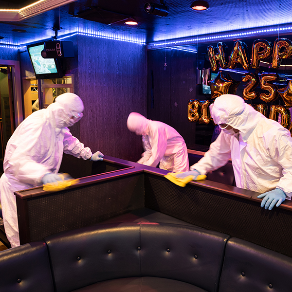 新型コロナウィルスの陽性者は出ておりませんが、陽性者発生を予防して、消毒作業を実施。毎月1回プロ仕様の徹底した消毒作業を行い、お客様に安心してご飲食を楽しんで頂いております。陽性者が発生すると店舗の売り上げに大きな影響があります。陽性者が発生してからでは遅いと判断し、定期的な消毒を実施しております。